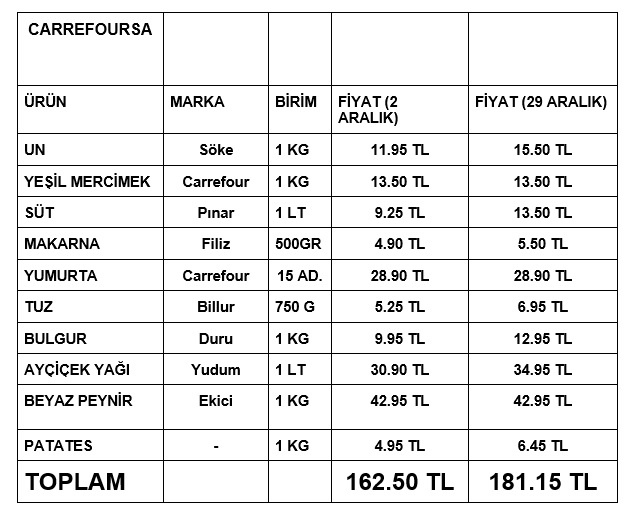 CHP Genel Başkanı Kemal Kılıçdaroğlu da 2 Aralık'ta market sahipleri ve yöneticilerine gönderdiği mektubu paylaşmış ve "10 temel ürüne zam yapmayın" demişti. Kılıçdaroğlu'nun bahsettiği sepetin fiyat listesini TELE1 2 Aralık'ta üç zincir marketten çıkarmıştı. İçerisinde un, yoğ, süt, bulgur, makarna, mercimek, yumurta, peynir, tuz ve patatesin olduğu sepetin fiyatının Carrefoursa’da 162.50 TL, MİGROS’ta 151.85 TL, A101’de ise 139.05 TL olduğu görülmüştü.