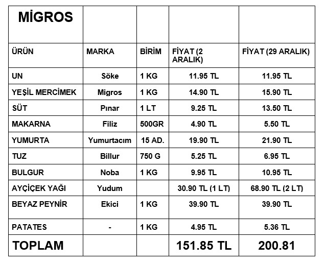 Aynı sepetin yeni fiyatı 29 Aralık'ta Carrefoursa’da 181.15 TL, MİGROS’ta 200.81 TL, A101’de ise 167.85 TL oldu. Üç zincir markete bakıldığında sepetteki en az 8 ürünün zamlandığı görüldü. Örneğin süte yüzde 40'a yakın zam yapılmış. Un ve makarnaya yapılan zam da dikkat çekiyor.
