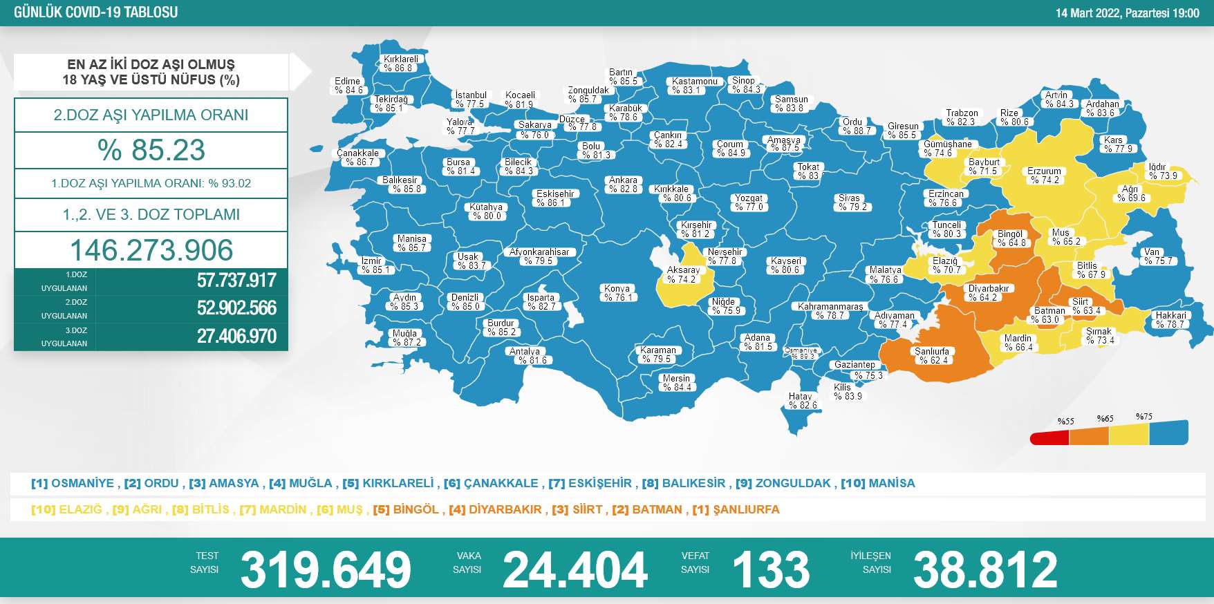 14 Mart 2022 koronavirüs tablosu verilerine göre; vaka sayısı 24 bin 404, iyileşen sayısı 38 bin 812 test sayısı 319 bin 649 olurken yaşamını yitiren kişi sayısı 133 oldu. Güncel koronavirüs tablosu ise şöyle: