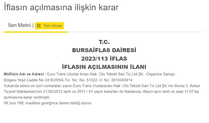 Bursa İflas Müdürlüğü tarafından alınan kararda, "Euro Trans Uluslar Arası Nak. Oto Tekstil San.Tic.Ltd.Şti. Organize Sanayi Bölgesi Yeşil Cadde No:34 Bursa -Tic. Sic. No. 51022 -V. No: 3810043914 Yukarıda adres ve sicil numaraları yazılı Euro Trans Uuslararası Nak. Oto Tekstil San.Tic.Ltd.Şti.'nin Bursa 3. Asliye Ticaret Mahkemesi'nin 21/06/2012 tarih ve 2011 / 91 sayılı kararları ile iflaslarına, iflasın aynı tarih ve saat 11:07'da açılmasına karar verilmiştir. İİK.nun 166. maddesi gereğince ilanen tebliğ olunur." ifadeleri yer aldı.