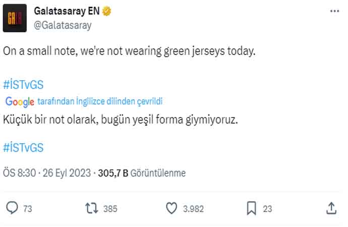 Süper Lig'de erteleme mücadelesinde İstanbulspor ile Galatasaray Atatürk Olimpiyat Stadyumu'nda karşı karşıya geldi. beIN Sports'ta yer alan haberede, Atatürk Olimpiyat Stadı’nda yanan çimler, makyajlama çalışması nedeniyle gıda boyasıyla yeşile boyandığı iddia edildi. Mücadele oynandığı sırada çimlerin yeşile boyanması üzerine boyanın oyuncuların formalarına ve üzerlerine geçtiği görüldü. Bu durum sosyal medyada da tartışma konusu oldu. Galatasaray da İngilizce hesabından bir paylaşım yaptı. Paylaşımda; "Küçük bir not: Bugün yeşil forma giymiyoruz" denildi.