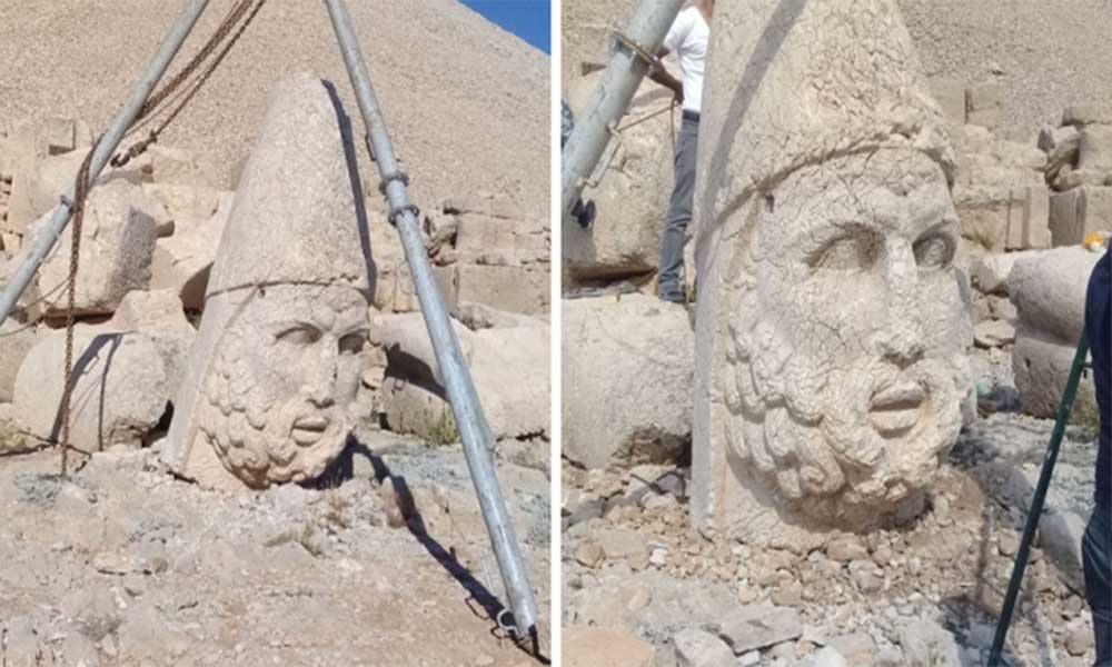 2 bin 206 metre yükseklikteki Nemrut Dağı'nın batı terasında bulunan Herakles heykeli, deprem ve kar yığının oluşturduğu baskı nedeniyle öne doğru eğildi. Devrilme tehlikesi olan heykelin düzeltilmesi için Adıyaman Müze Müdürlüğü yetkileri, Şanlıurfa Kültür Varlıklarını Koruma Kurulu'ndan izin aldı.