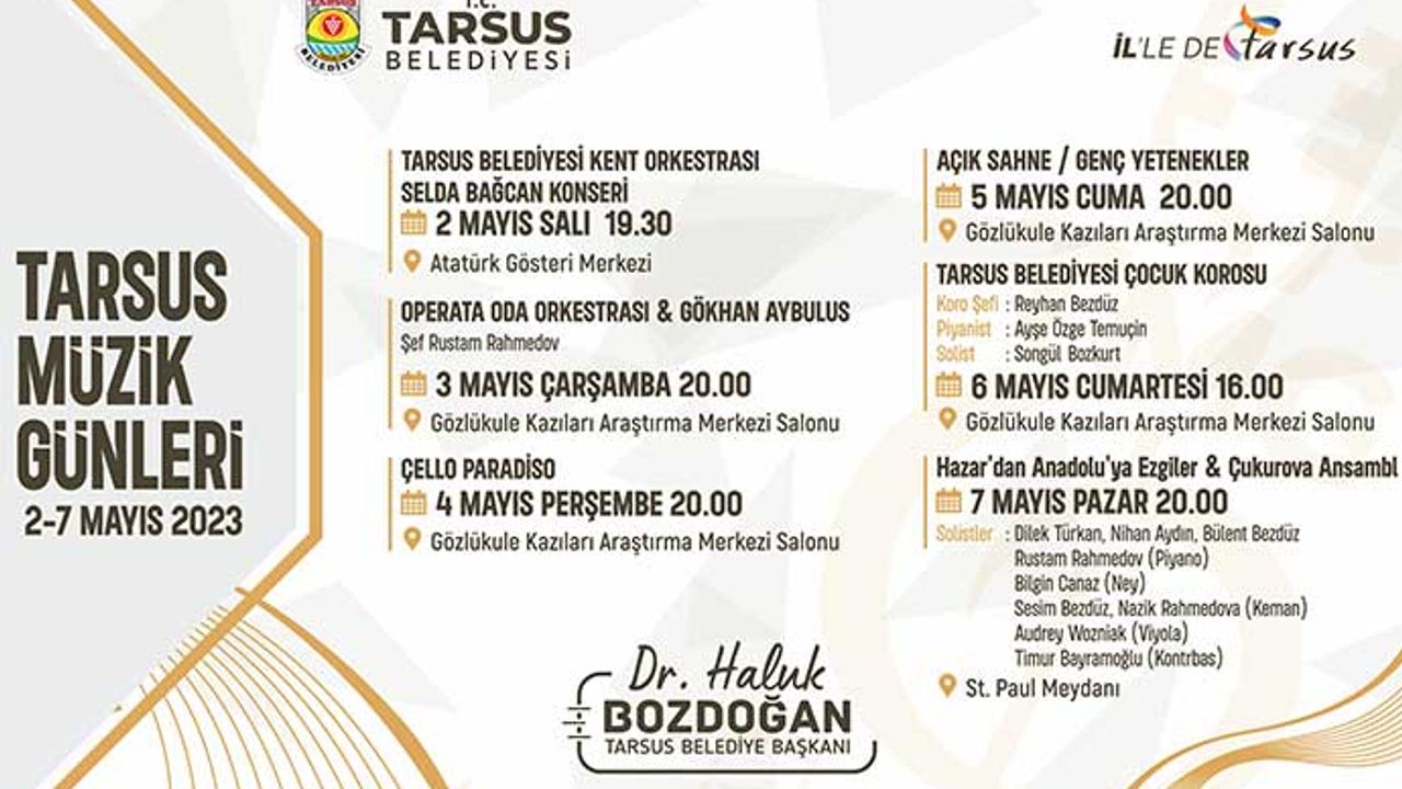 Tarsus Belediye Başkanı Dr. Haluk Bozdoğan “ Tarsus’umuzu müziğin, sanatın kenti olarak taçlandırıyoruz. 2. Tarsus Müzik Günleri’nde birbirinden değerli sanatçılarımızı 2-7 Mayıs tarihleri boyunca hemşehrilerimizle buluşturuyoruz. Konserlerimize tüm halkımız davetlidir.” ifadelerini kullandı.