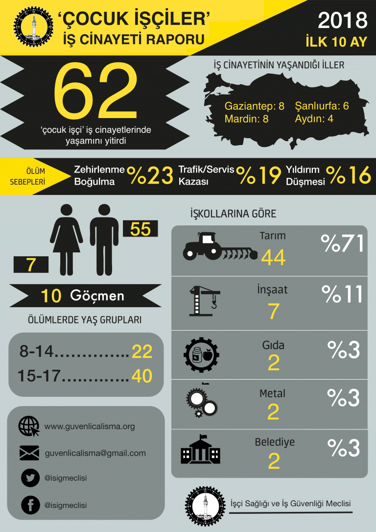 İşçi Sağlığı ve İş Güvenliği Meclisi tarafından hazırlanan rapora göre, 2018'in ilk on ayında en az 62 çocuk işçi yaşamını yitirdi.