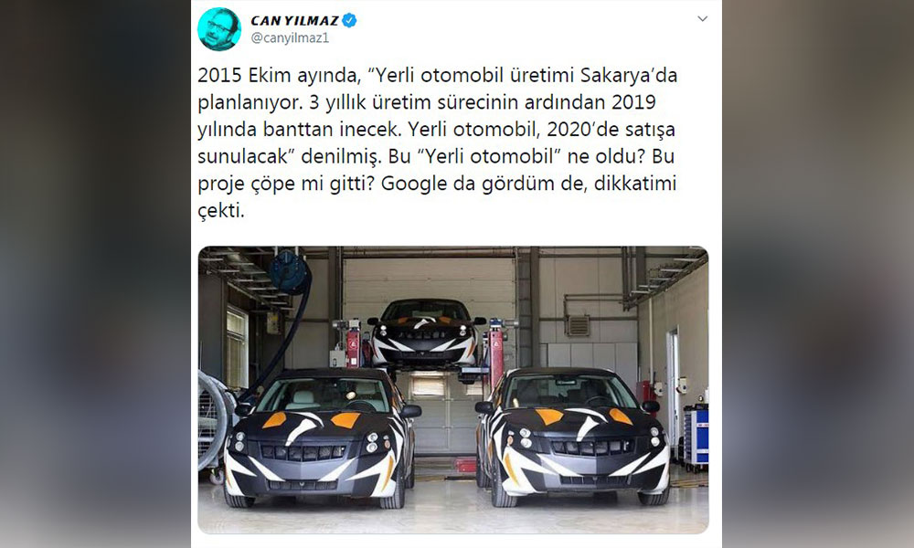 Usta komedyan Cem Yılmaz'ın ağabeyi Can Yılmaz, tartışmalara sebep olan 'yerli otomobil' hakkında sosyal paylaşım sitesi Twitter'dan soru yöneltti. Can Yılmaz, "2015 Ekim ayında, “Yerli otomobil üretimi Sakarya’da planlanıyor. 3 yıllık üretim sürecinin ardından 2019 yılında banttan inecek. Yerli otomobil, 2020’de satışa sunulacak” denilmiş. Bu “Yerli otomobil” ne oldu? Bu proje çöpe mi gitti? Google da gördüm de, dikkatimi çekti" ifadelerini kullandı.NE OLMUŞTU?