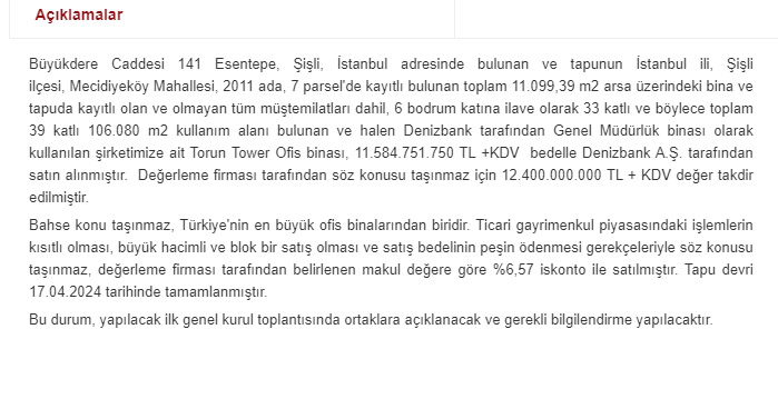 Torunlar GYO, portföyünde bulunan ve Denizbank tarafından genel müdürlük binası olarak kullanılan, İstanbul'un Şişli ilçesindeki 39 katlı Torun Tower Ofis binasının 11,6 milyar TL artı KDV bedelle Denizbank tarafından satın alındığını duyurdu. https://tele1.com.tr/mecidiyekoyde-bulunan-torun-center-binasinda-yangin-943013/KAP'A AÇIKLAMA YAPILDI