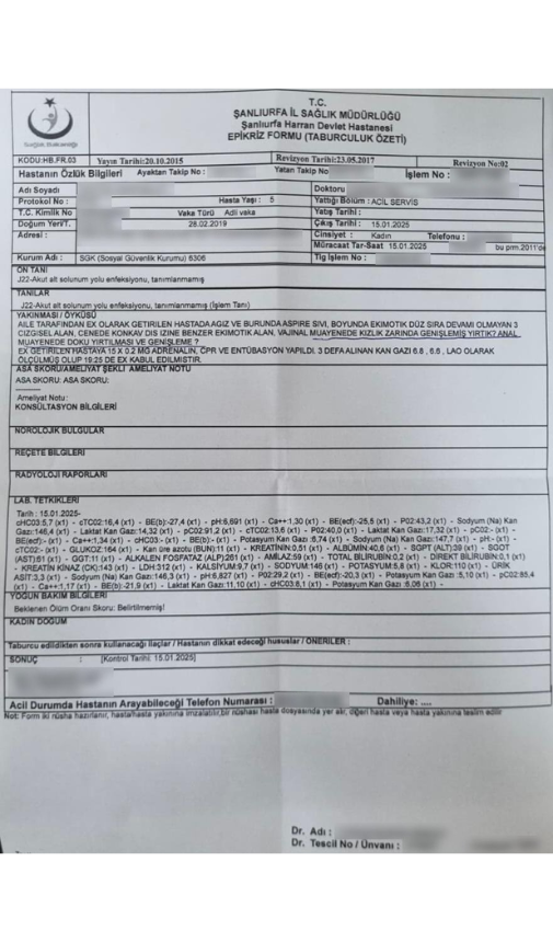 Şanlıurfa Harran Devlet Hastanesi'nde 5 yaşındaki bir kız çocuğu, ailesi tarafından ölü olarak hastaneye getirildi. Çocuğun ilk muayenesinde ağzında ve burnunda sıvı; boynunda ve çenesinde diş izine benzer bir iz, vajinal ve makat muayenesinde ise yırtık tespit edildi.