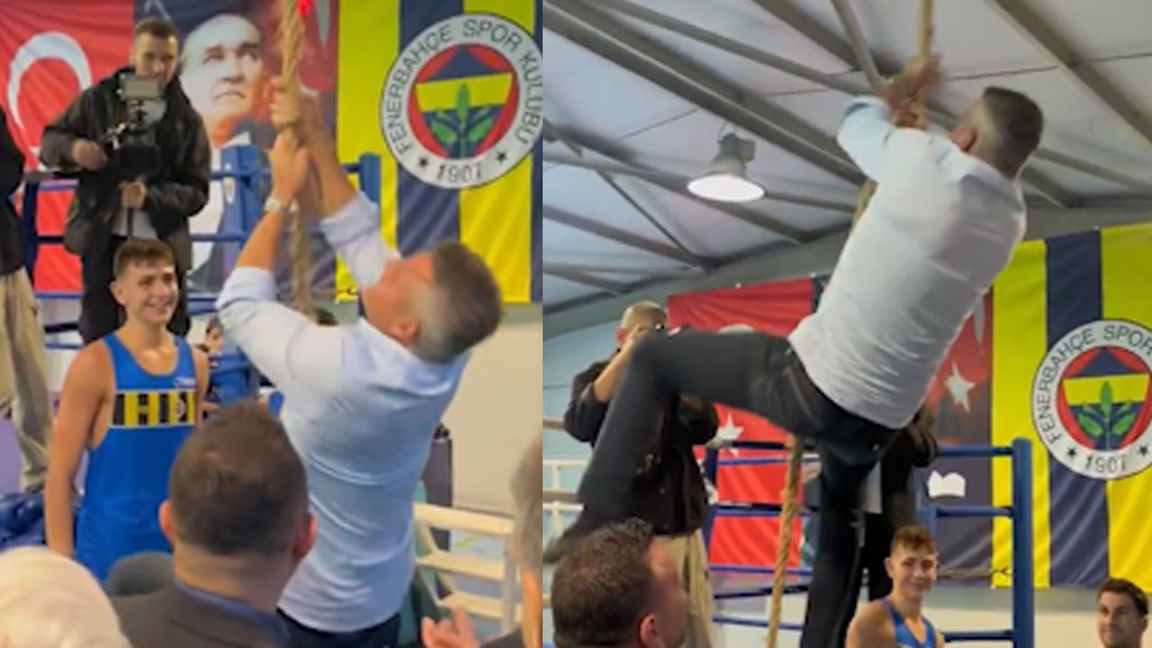Eski milli sporcu 61 yaşındaki Fenerbahçe Başkanı Saddettin Saran'ın halat tırmanışı sosyal medyada gündem oldu. Daha önce kişisel hesaplarından spor yaptığı anlara ait sık sık paylaşımlar yapan Başkan Saran bu kez Fenerbahçe'nin genç boksçularını ziyareti sırasında üzerindeki gömlek ve kot pantolonuna rağmen zor bir 'şov' sergiledi