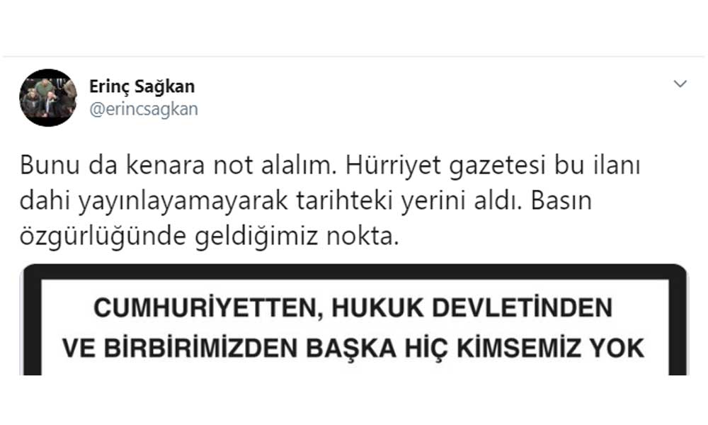 Ankara Barosu Başkanı Erinç Sağkan ise ilanın Hürriyet Gazetesi'nde yayınlanmadığını belirterek tepki gösterdi. Sağkan, "Hürriyet gazetesi bu ilanı dahi yayınlayamayarak tarihteki yerini aldı. Basın özgürlüğünde geldiğimiz nokta" dedi.