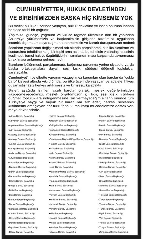 "Bu ülke üzerinde yaşayan, hukuk devletine ve insan onuruna inanan her vatandaşa tarihi bir çağrıdır" diyen 78 baro, gazetelere ilan verdi. Açıklamada, "Barolar 'çoklu baro' kisvesi altında yıkıldığında, bu ülke üzerinde yaşayan ve adalete ihtiyaç duyan istisnasız herkes artık sessiz ve kimsesiz kalacaktır" denildi. İlan, Hürriyet Gazetesi'nde yayınlanmadı.