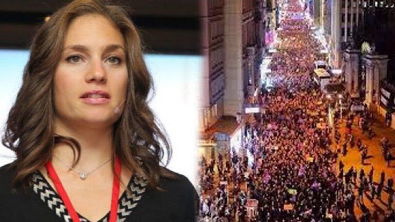 Nenviş Mengü ezanın Taksim Camii'nden okunduğunu söylese de İstiklal'in Taksim çıkışında, Fransız Konsolosluğu'nun kuzey cephesine bakan soldaki sokakta küçük bir camiden ezanın okunduğu da iddia ediliyor Erdoğan'ın protesto sırasında "ezanı ıslıkladılar" sözlerinin ardından vatandaş ikiye bölündü. Kimisi Erdoğan'ı desteklerken, özellikle AKP'li pek çok isim de dahil olmak üzere kimi vatandaş da Erdoğan'a tepki gösterdi. Gazeteci ve Birgün gazetesi yazarı Nevşin Mengü, 8 Mart yürüyüşünde her iki görüşün de düşüncelerine yer verdikten sonra kimsenin farketmediği şu ayrıntıdan bahsetti: "Olaya ilişkin bir başka detay daha var. 8 Mart gecesi ezan henüz bitmemiş olan Taksim Camii’nden okunuyor. Henüz bitmemiş camiiden acaba ne zaman ezan okunmaya başlandı." İŞTE MENGÜ'NÜN O YAZISI Her 8 Mart’ta olduğu gibi bu 8 Mart’ta da kadınlar feminist gece yürüyüşü yapmak istedi. Yetkililer önce izin vermeyiz demişler, sonra izin verilmiş. Fransız Kültür Merkezi’nin önüne kadar yürüyebilirsiniz demişler. Malum Gezi ve Taksim Meydanı artık yasaklı bölge. Meydanda ve Park’ta haber ya da program amaçlı çekim yapmak için bile gidip özel izin almak gerekiyor. Feminist gece yürüyüşüne katılanlar, Galatasaray Lisesi’nin oradan Fransız Kültür Merkezi’ne kadar yürüdü, ancak burada polis müdahalesiyle karşılaştı. Kadınlar gazdan ve fişeklerden ezan sesini bile duymadık diyor. Polisler hem sert müdahale etmiş, hem de kalabalığı sıkıştırmışlar. Kadınlar polis müdahalesini ıslıklarla protesto etmiş. Ne var ki o ana ait görüntüler sosyal medyada bazı hesaplar tarafından, kadınlar ezanı protesto ettiler şeklinde paylaşılmaya başlandı. Bu paylaşımlar hız kazanırken, Yeni Şafak gazetesi de twitter hesabından, “Taksim’de rezalet görüntüler: Sözde kadın hakları savunucularının ezan okunduğu sırada hazımsızlıkları tuttu. Savunduklarını iddia ettikleri birlikte yaşama kültürlerini ezanı ıslıkla protesto ederek gösterdiler.” ifadeleri paylaşıldı. Aşağı yukarı aynı saatlerde Cumhurbaşkanı pazar günü, yürüyüşten görüntüleri yaptığı mitingde izleterek,“Ezana ıslıklarla, sloganlarla terbiyesizlik ettiler. Bunların tek ittifakı ezan bayrak düşmanlığıdır” dedi. Pazar gecesi, yine bazı Twitter hesaplarından, “ezan dinmez bayrak inmez” sloganı altında protesto gösterisi çağrıları yapıldı. Ve gece bir grup tekbir getirerek Taksim’de yürüdü. Bu gruba da polis aynı şekilde gaz sıkarak müdahale etti.