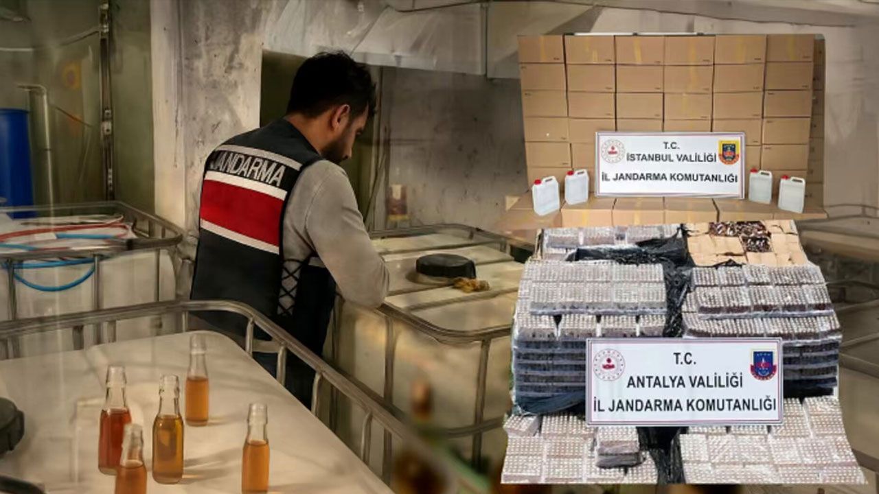 Jandarma ekiplerinin belirlenen adreslere yaptıkları baskınlarda, 33 bin 554 litre sahte alkol ile 29 bin 63 litre etil alkol ele geçirildi.