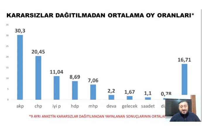 Özkiraz'ın hazırladığı tabloda, kararsız seçmen dağıtılmadan önce partilerin oy oranları gösterildi. Kararsız seçmen bloğunun yüzde 16'yı geçmesi ise dikkat çekti. Kararsızlar dağıtılmadan önce AKP'nin oy oranı yüzde 30.3 iken, MHP'nin oy oranı 7.06 olarak saptandı.