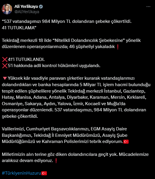İçileri Bakanı Ali Yerlikaya sosyal medya hesabından yüksek kar vaadi ile vatandaşları dolandıran şebekeye yapılan operasyonun detaylarını açıkladı. Tekirdağ merkezli 18 ilde yapılan operasyonda 46 şüpheli şahıs yakalandı. Yakalanan şahıslardan 41'i de tutuklandı.