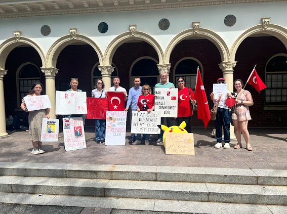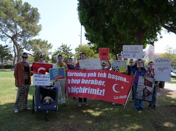 Los Angeles’ta Ekrem İmamoğlu maskeleriyle Türkiye Cumhuriyeti Los Angeles Başkonsolosluğu önünde toplanan grup, “bir gider, milyonlar geri gelir” mesajı verildi.