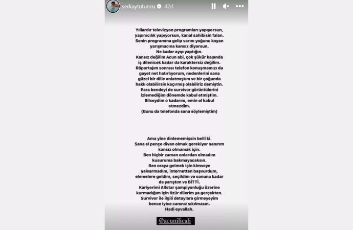 Acun Ilıcalı'nın, katıldığı bir programda 'kansız' dediği kişinin 2016'da Survivor finalisti olup şimdilerde oyunculuk yapan Serkay Tütüncü olduğu iddia edilirken Tütüncü'den Ilıcalı'ya sert yanıt geldi.
