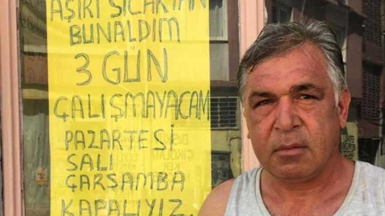 Paylaşılan fotoğrafta bir esnaf camına, "Aşırı sıcaktan bunaldım. 3 gün çalışmayacağım. Pazartesi, salı, çarşamba kapalıyız" yazan bir pankart yapıştırdı.