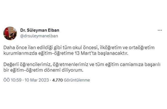Adana Valisi Süleyman Elban, ildeki eğitim kurumlarının açılış tarihi ile ilgili açıklamada bulundu. Sosyal medya hesabından açıklama yapan Süleyman Elban, “Daha önce ilan edildiği gibi tüm okul öncesi, ilköğretim ve ortaöğretim kurumlarımızda eğitim-öğretime 13 Mart'ta başlanacaktır. Değerli öğrencilerimiz, öğretmenlerimiz ve tüm eğitim camiamıza başarılı bir eğitim-öğretim dönemi diliyorum” ifadelerini kullandı.