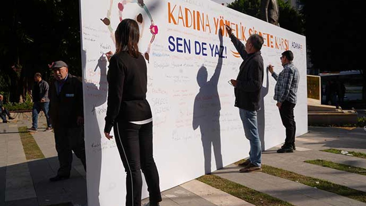 Adana Büyükşehir Belediyesi, kadına yönelik şiddetin son bulması için 16 günlük aktivizm programını sürdürüyor. 25 Kasım Kadına Yönelik Şiddete Karşı Uluslararası Mücadele Günü'nden 10 Aralık Dünya İnsan Hakları Günü' ne kadar kadına ve kız çocuklarına yönelik şiddete karşı farkındalık oluşturmak amacıyla düzenlenen 16 günlük aktivizm kapsamında Adana'nın en işlek noktalarında Kadına Yönelik Şiddete Karşı Sen de Yaz panoları kuruldu. Adana Büyükşehir Belediyesi Kadın ve Aile Hizmetleri Daire Başkanlığı’nca İnönü Parkı, Büyüksaat, Adnan Menderes Bulvarı, Baraj Yolu Duygu Kafe, Güney Yıldızı Parkı, Kenan Evren Bulvarı, Sarıçam'da Yıldırım Beyazıt Mahallesi, Yüreğir'de ise Mustafa Kemal Paşa Bulvarı'na Şiddete Karşı Sen de Yaz panosu kuruldu. Panolara yüzlerce kişi tarafından şiddet karşıtı mesajlar yazıldı, kadına yönelik şiddetin önlenmesiyle ilgili mesaj verildi. 1500 kişiye Kadına Yönelik Şiddet ile ilgili bilgilendirme broşürü, çocuk ihmal ve istismarı bilgilendirme broşürü ile KADES broşürü dağıtıldı. Ayrıca Adana'da düzenlenen Portakal Çiçeği Karnavalı ( 23-27 Mart 2022) ve Çocuk Festivali'nde (6-8 Mayıs 2022) kadınlar ve çocukların 'Şiddete Karşı' yazdıkları mesajların yer aldığı Kadına Yönelik Şiddete Karşı Sen de Yaz broşürü dağıtıldı. İnönü Parkı’nda Kadın ve Aile Hizmetleri Dairesi Başkanlığı tarafından kadına yönelik şiddetle ilgili farkındalık yaratmak amacıyla stant kuruldu, kadına yönelik şiddetle ilgili bilgilendirme broşürü dağıtıldı. Ayrıca kadınların şiddete maruz kalmaları durumunda 7/24 ulaşabilecekleri numaraların bilgisi verildi.