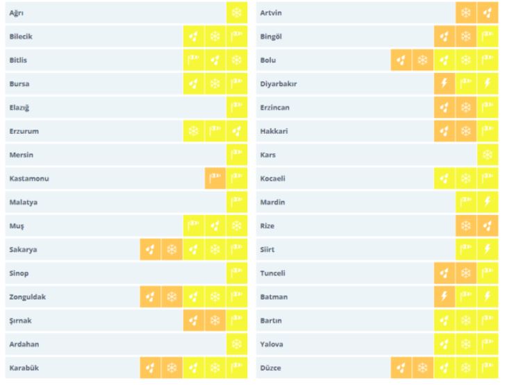 Açıklamada, Ağrı, Ardahan, Bartın, Bilecik, Bitlis, Bursa, Elazığ, Erzurum, Kars, Kocaeli, Malatya, Mardin, Mersin, Muş, Siirt ve Yalova için ise sarı meteorolojik uyarı yapıldığı belirtildi.