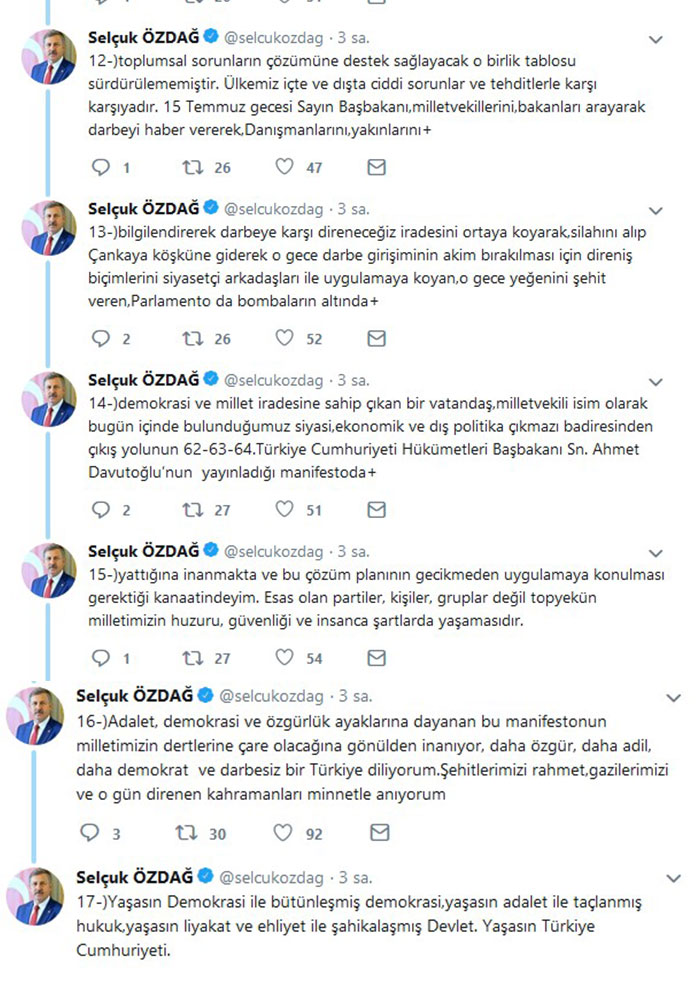 Yeni parti kurma hazırlığındaki AKP’li eski Başbakan Ahmet Davutoğlu’na yakın isimler, 15 Temmuz FETÖ darbe girişimi ile ilgili mesajlarında AKP’yi çok sert bir dille eleştirdiler. O isimler arasında, bir dönem AKP’nin Ankara ve İstanbul il başkanlıklarını yapmış, yine AKP’den milletvekili olmuş siyasiler yer alıyor. https://tele1.com.tr/istifa-sonrasi-ahmet-davutoglu-cephesinde-moraller-bozuldu-67230/ Davutoğlu’nun ekibinden, AKP eski Ankara İl Başkanı Nedim Yamalı, “Reformların yapılmaması, açık uyarılara rağmen yanlışlarda ısrar edilmesi bu mücadeledeki samimiyet ve beceri konusunda zihinlerde tereddüt oluşturuyor” ifadelerini kullandı ve şöyle devam etti; “Devletler böyle büyük badireler atlattıktan sonra yeni hukuk anlayışları geliştirir, şeffaflıkta,kamunun ehliyet ve liyakata göre yapılanmasında büyük reformlar yapabilirlerse saygıyı ve desteği hakederler,o ülkenin insanlarıda idarecilerinin yanında kenetlenir. Rabbimiz bizleri fetö ve benzeri hastalıklı yapıların saldırısından, basiretsiz yöneticilerden, birliğimizi ve güvenliğimizi zedeleyecek davranışlardan korusun. Bu asil milleti her zaman güçlü, başarılı ve huzur içinde kılsın inşallah.” Yine Davutoğlu’na yakınlığıyla bilinen AKP eski İstanbul İl Başkanı Selim Temurci de, “Ülkemiz; adalette, kalkınmada, demokratik normlarda, dış politikada, devlet yönetiminde, iç siyasette adı konmamış çok ciddi krizler yaşamaktadır. Bu millet, her ne şartta olursa olsun, sıkıntılarla nasıl baş edeceğini 15 Temmuz’da göstermiştir” şeklindeki mesajıyla AKP’ye sert eleştirilerden bulundu. Davutoğlu’na yakın bir diğer isim, AKP eski Milletvekili Selçuk Özdağ da yazdığı 15 Temmuz mesajlarında, “Darbelerle mücadelenin yolu otoriterleşmek değil, adalet, demokrasi, güvenlik ve özgürlük dengesini doğru kurmaktır. Bu kurulamadığı için toplumda her geçen gün büyüyen yakınmalar ve adalet duygusunu örseleyen manzaralar ortaya çıkmıştır” ifadelerini kullanarak AKP’ye sert çıktı.NEDİM YAMALI'NIN MESAJLARI