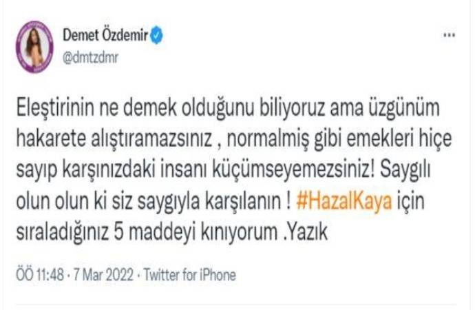Özdemir, sosyal medyada şu ifadeleri kullandı; "Eleştirinin ne demek olduğunu biliyoruz ama üzgünüm hakarete alıştıramazsınız, normalmiş gibi emekleri hiçe sayıp karşınızdaki insanı küçümseyemezsiniz! Saygılı olun olun ki siz saygıyla karşılanın ! #HazalKaya için sıraladığınız 5 maddeyi kınıyorum .Yazık..."