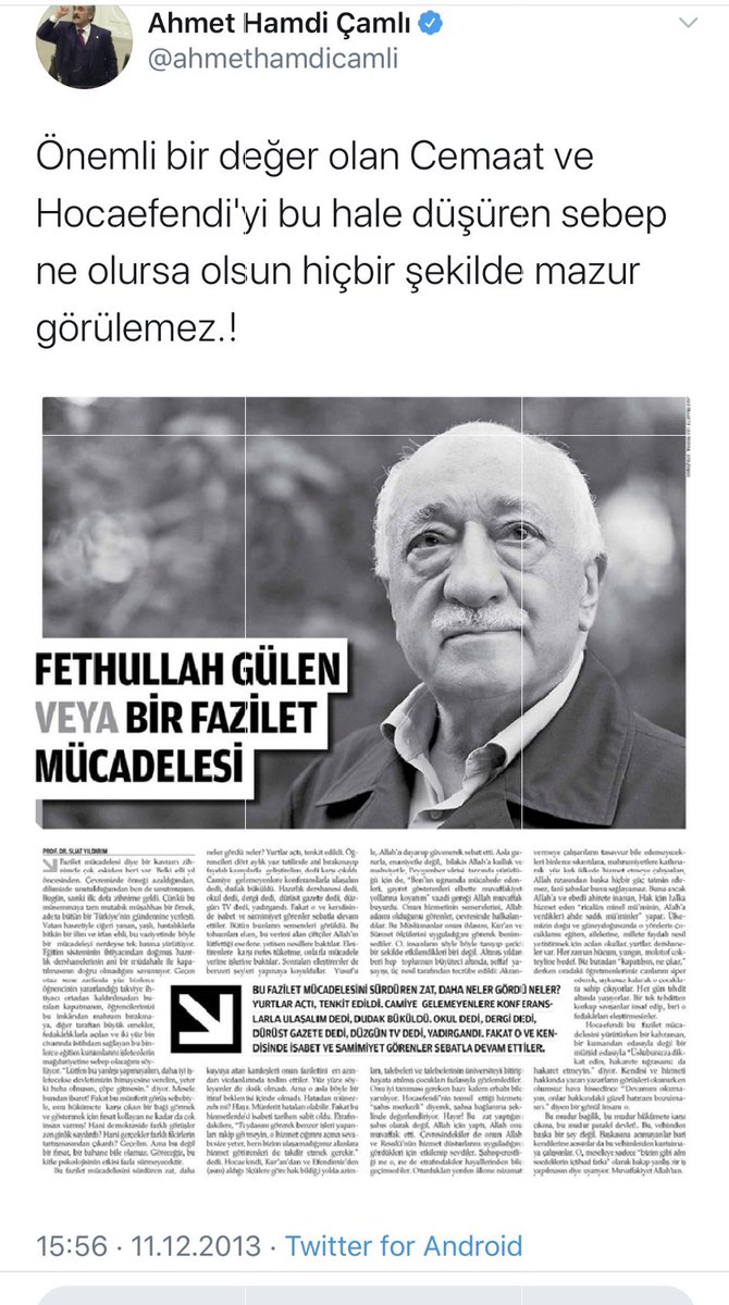 Olçok'un "buldum" dediği paylaşım, yurt dışına kaçtığı belirtilen Prof. Dr. Suat Yıldırım'ın "Fethullah Gülen veya Bir Fazilet Mücadelesi" başlıklı yazısını alıntılayan AKP'li vekil Ahmet Hamdi Çamlı'nın "Önemli bir değer olan Cemaat ve Hocaefendi'yi bu hale düşüren sebep ne olursa hiçbir şekilde mazur görülemez!" cümleleriydi. https://tele1.com.tr/akp-kongresine-gelenler-ahmet-hamdi-camlinin-ne-dedigini-bir-turlu-anlayamadi-226963/ T24'te yer alan habere göre; Çamlı'nın alıntı yaptığı yazının tarihi 11 Aralık 2013. O yazıda Suat Yıldırım, Gülen'i överek o dönem dershanelerin kapatılmasına karşı çıktı. Yıldırım o yazıda şunları kaydetti: "Ülkemizin doğu ve güneydoğusunda o yörelerin çocuklarını eğiten, ailelerine, millete faydalı nesil yetiştirmek için açılan okullar, yurtlar, dershaneler var. Her zaman hücum, yangın, molotof kokteyline hedef. Biz buradan “kapatılsın, ne çıkar,” derken oradaki öğretmenlerimiz canlarını siper ederek, uykusuz kalarak o çocuklara sahip çıkıyorlar. Her gün tehdit altında yaşıyorlar. Bir tek tehditten korkup sıvışanlar insaf edip, bari o fedakârları eleştirmesinler." https://tele1.com.tr/akpli-camli-toplumsal-cinsiyet-esitligi-ciddi-rahatsizlik-uyandiriyor-196269/ Nihal Olçok Twitter paylaşımında Cumhurbaşkanı Erdoğan'ı da etiketledi ve "Aaa bir de sayın Cumhurbaşkanı Erdoğan'a da göndereyim arşive koyarlar belki. Kimler kimlerle değim mi?" dedi.