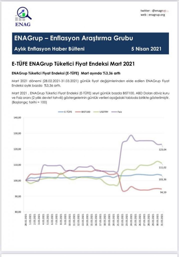 Ekonomistler ve akademisyenlerin oluşturduğu Enflasyon Araştırma Grubu'na (ENAGrup) göre, Eylül 2020-Mart 2021 döneminde TÜFE yüzde 27.89 oranında arttı. TÜİK’in aylık yüzde 1.06 dediği enflasyon rakamı ENAG'a göre yüzde 3.36.
