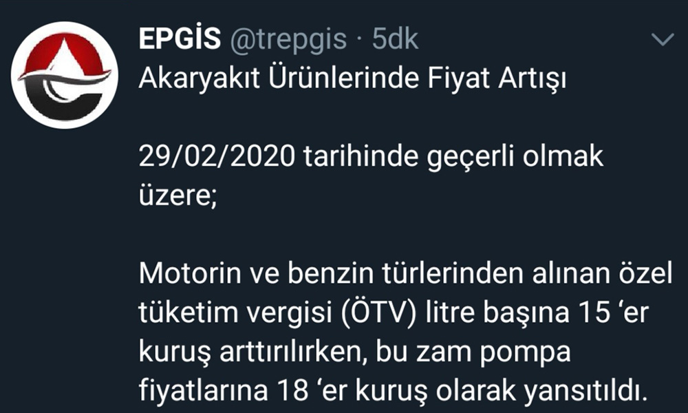 Resmi Gazete'de yayınlanan 2178 karar sayılı düzenlenlemeye göre akaryakıtlar için uygulanan Özel Tüketim Vergisi'nde (ÖTV) değişiklik yapıldı. ÖTV tutarı litrede 1,9059 liradan 2,0559 liraya çıkarıldı. Değişiklik ile %7.98 zam yapılmış oldu. 29 Şubat itibariyle indirim yapılan benzin ve motorine 18 kuruş zam yapıldı.