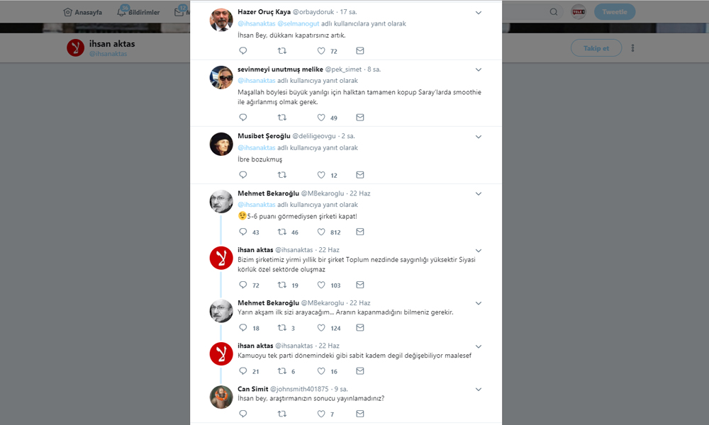 https://tele1.com.tr/konda-23-haziran-sonucunu-bildi-iste-o-anket-63067/ GENAR Araştırma Genel Müdürü İhsan Aktaş, sosyal medya hesabı twitter üzerinde 22 Haziran'da seçim sonuçları hakkında "İbre Binali Yıldırım'ın lehine döndü. Ak Pati örgütü büyük bir yapı, harekete geçmesi zor oluyor. Fakat iş yapmaya başlayınca verilmiliği yüksek oluyor. Kapı kapı dolaşıp seçmeni ikna etme çabaları etkili oldu" değerlendirmesinde bulunmuştu. Aktaş'ın yorumuna sosyal medya kullanıcıları tepki göstererek 'şirketi kapat' tepkisinde bulundu.İbre Binali Yıldırım'ın lehine döndü. Ak Pati örgütü büyük bir yapı ,harekete geçmesi zor oluyor. Fakat iş yapmaya başlayınca verilmiliği yüksek oluyor. Kapı kapı dolaşıp seçmeni ikna etme çabaları etkili oldu