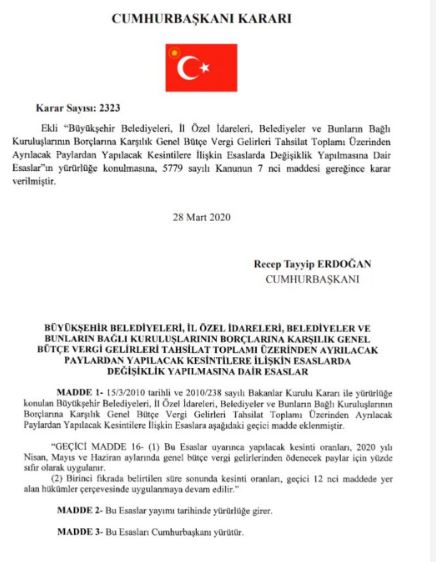 Cumhurbaşkanlığı kararnamesi ile belediyelerden koronavirüs ile mücadele kapsamında 3 ay kesinti yapılmayacağı belirtilirken CHP'li Hacıbektaş Belediyesi'nden 258 bin lira kesinti yapıldığı ortaya çıktı. AKP Genel Başkanı ve Cumhurbaşkanı Erdoğan'ın imzaladığı kararla belediyelerden yeni tip koronavirüs ile mücadele kapsamında 3 ay kesinti yapılmayacaktı. Nisan, Mayıs, Haziran aylarında bu kesintinin yapılmamasıyla belediyeler 3 milyar TL tutarında kaynak elde edecebilecek ve belediyelerin salgın ile mücadelesindeki maddi engeller aşılacaktı. CHP Genel Başkan Yardımcısı ve İzmir Milletvekili sosyal medya hesabında durumun böyle olmadığını evraklarıyla paylaşarak şu ifadeleri kullandı.AKP KORONAYLA DEĞİL CHP'Lİ BELEDİYELERLE MÜCADELE EDİYOR!