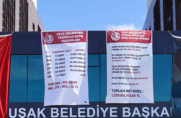 Yerel seçimlerde AKP'den CHP yönetimine geçen Uşak Belediyesi'nin geçmiş dönem borcu 1 milyar 276 milyon 816 bin 921 TL olarak açıklandı.