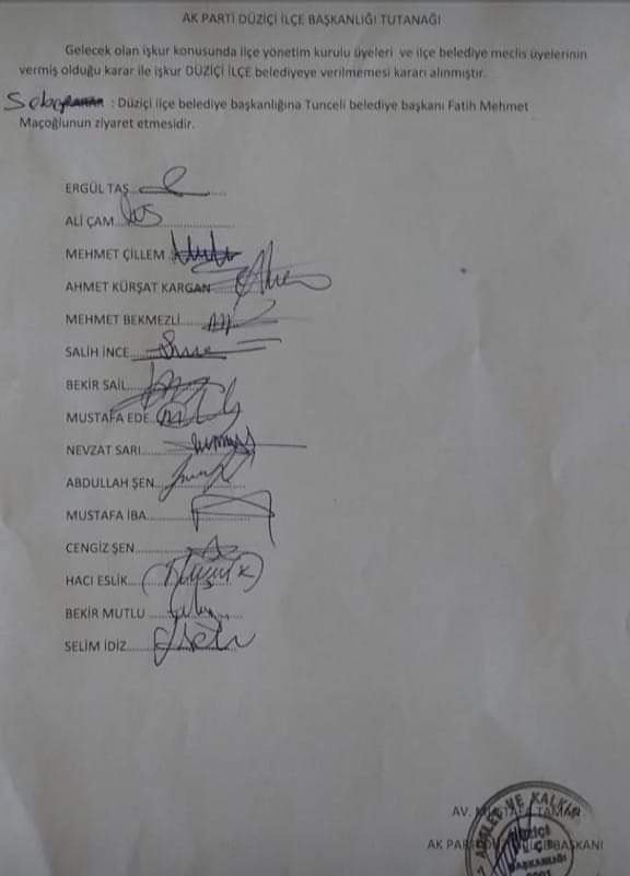 Tutanaktaki yazıda "Gelecek olan işkur konusunda ilçe yönetim kurulu üyeleri ve ilçe belediye meclis üyelerinin vermiş olduğu karar ile işkur Düziçi İlçe belediyeye verilmemesi kararı alınmıştır. Sebep Düziçi ilçe belediye başkanlığına Tunceli belediye başkanı Fatih Mehmet Maçoğlu'nun ziyaret etmesidir” ifadeleri yer aldı.