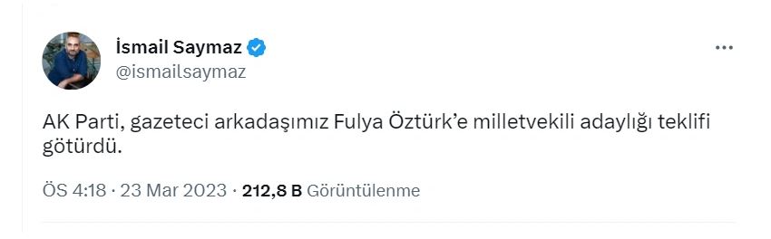 Gazeteci İsmail Saymaz, AKP'nin Fulya Öztürk’e milletvekili adaylığı teklifi götürdüğünü iddia etti.