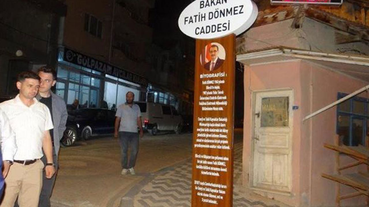 Sözcü'den Deniz Ayhan'ın haberine göre Belediye Başkanı Hayri Suer, Bakan Dönmez'in biyografisinin ve adının yazılı olduğu cadde tabelasını ilçeyi ziyarete gelen Bakan Dönmez'e takdim etti ve Gölpazarı'na büyük desteklerinden dolayı teşekkürlerini bildirdi. Memleketinde adının caddeye verilmesinin kendisini duygulandırdığını belirten Bakan Dönmez ise, “Çocukluğumuz burada geçti. Bu sokak ve caddelerde bizler de koşturduk. Şu an belediye başkanımız ve belediye meclis üyelerimizin kararı ile eski adı Orgeneral Aytaç Yalman Caddesine benim ismimi vermişler. Aslında ben baba ocağımı ziyarete geldim. Bu gece bana bir sürpriz yaptılar. Burada çocukluk arkadaşlarım da var. Onlarla da hasbıhal ettik. Bu güzel sürprizde emeği geçen herkese teşekkür ederim. Küçükken oynadığımız caddeye ismimin verilmesi beni çok duygulandırdı” dedi.