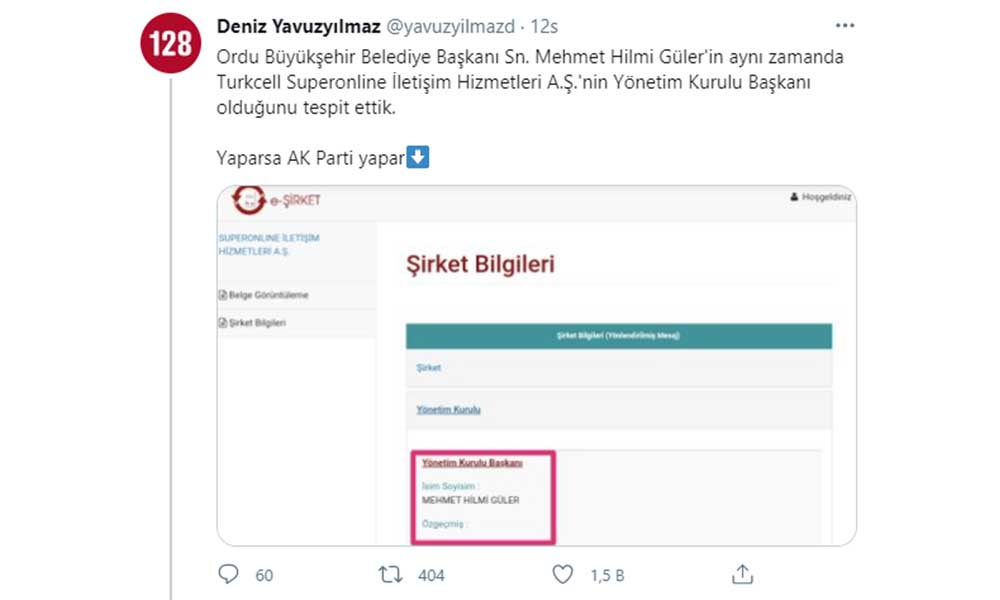 Yavuzyılmaz, paylaşımında şu ifadelere yer verdi: "Ordu Büyükşehir Belediye Başkanı Sn. Mehmet Hilmi Güler'in aynı zamanda Turkcell Superonline İletişim Hizmetleri A.Ş.'nin Yönetim Kurulu Başkanı olduğunu tespit ettik. Yaparsa AK Parti yapar."