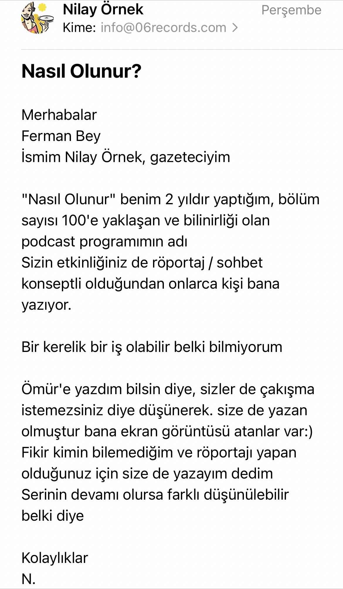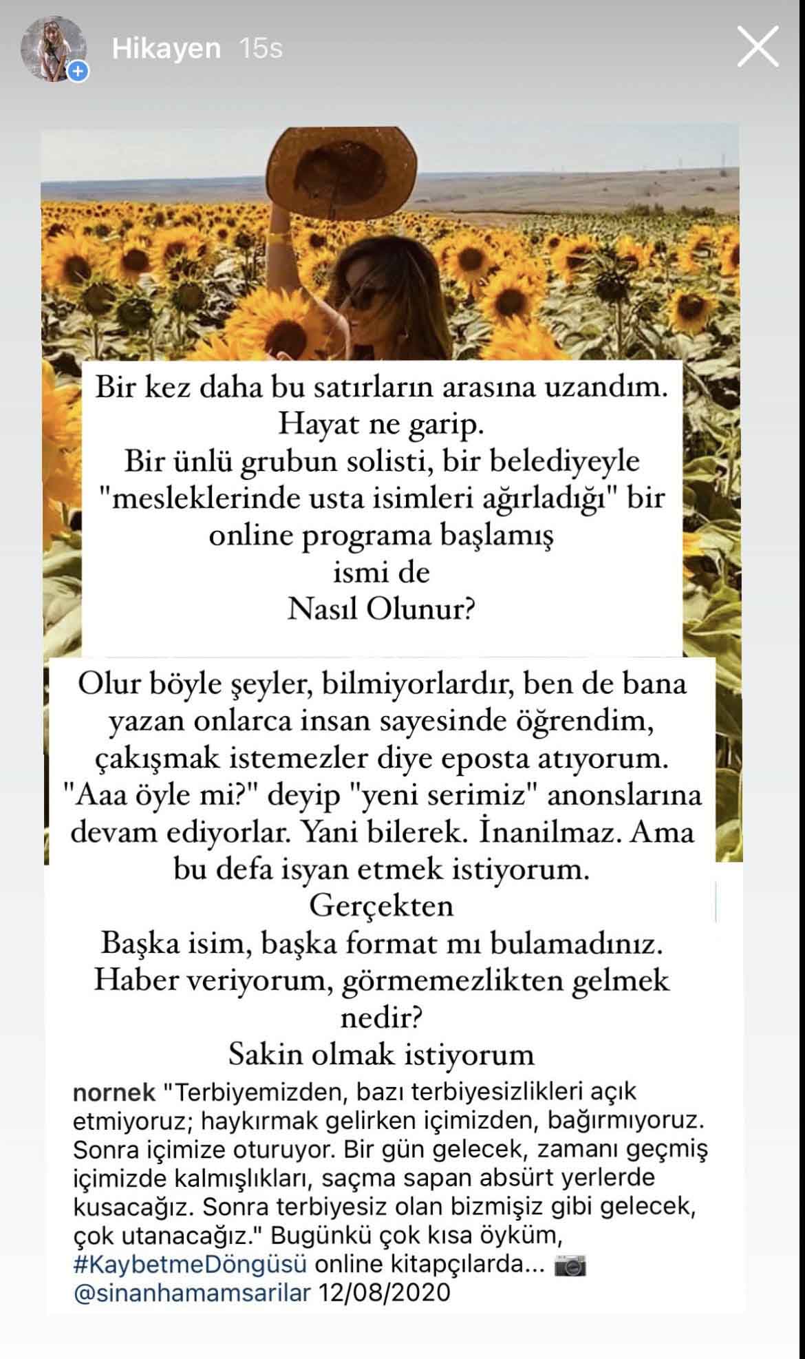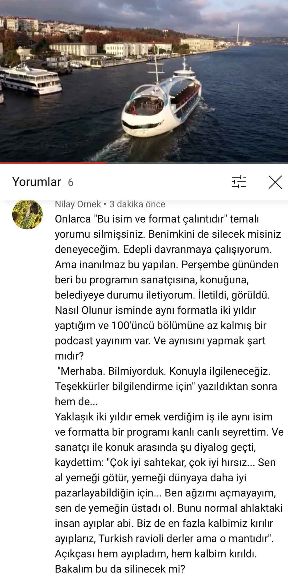 Gazeteci Nilay Örnek, sosyal medyadan yaptığı paylaşımlarla AKP’li Üsküdar Belediyesi’ne, kendi program ismi ve formatının kullanılması nedeniyle tepki gösterdi. Belediye, program hakkındaki ‘çalıntı’ yorumlarını sildi. Gazeteci Nilay Örnek, Spotify ve iTunes üzerinden yayınladığı “Nasıl olunur” podcast programının isminin ve içeriğinin, Üsküdar Belediyesi tarafından başka bir programda kullanılmasına tepki gösterdi. Mart 2019’dan bu yana aynı isimde içerik üretip program yapan Nilay Örnek, sosyal medya hesabı üzerinden yaptığı paylaşımda, “İnsanlar her şeyi, herkesi bilmek zorunda değil. Ha bir Google insana neler öğretiyor o ayrı, insan iş yaparken yapacağı formata, isme bir bakar bence” diye yazdı. Programın belediye tarafından Youtube üzerindeki paylaşımının altındaki “çalıntı” olduğuna dair yorumlar ise silindi. Daha sonra videonun altındaki yorum bölümü ise belediye tarafından tamamen kapatıldı. Nilay Örnek de yapılanlar karşısında, “Edepli davranmaya çalışıyorum ama inanılmaz bu yapılan. Perşembe gününden beri bu programın sanatçısına, konuğuna, belediyeye durumu iletiyorum. İletildi, görüldü. Nasıl Olunur isminde aynı formatta iki yıldır yaptığım ve 100’üncü bölümüne az kalmış bir podcast yayınım var. Ve aynısını yapmak şart mıdır” ifadelerini kullandı. Örnek, yapım şirketinden ise kendisine, “Merhaba. Bilmiyorduk. Konuyla ilgileneceğiz. Teşekkürler bilgilendirme için” yanıtının verildiğini aktardı.İşte o paylaşımlar: