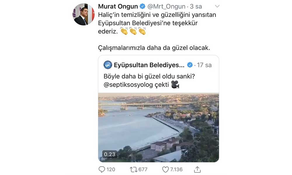 AKP’li Eyüpsultan Belediyesi, Haliç’in güzelliğini gösteren videosunu, İstanbul Büyükşehir Belediye Sözcüsü Murat Ongun’dan teşekkür gelince sildi.AKP’li Eyüpsultan Belediyesi, dün Haliç’e ait bir videoyu “Böyle daha bir güzel oldu sanki” notuyla paylaştı. Bu paylaşımı alıntılayan İBB Sözcüsü Murat Ongun, “Haliç’in temizliğini ve güzelliğini yansıtan Eyüpsultan Belediyesi’ne teşekkür ederiz. Çalışmalarımızla daha da güzel olacak” dedi.