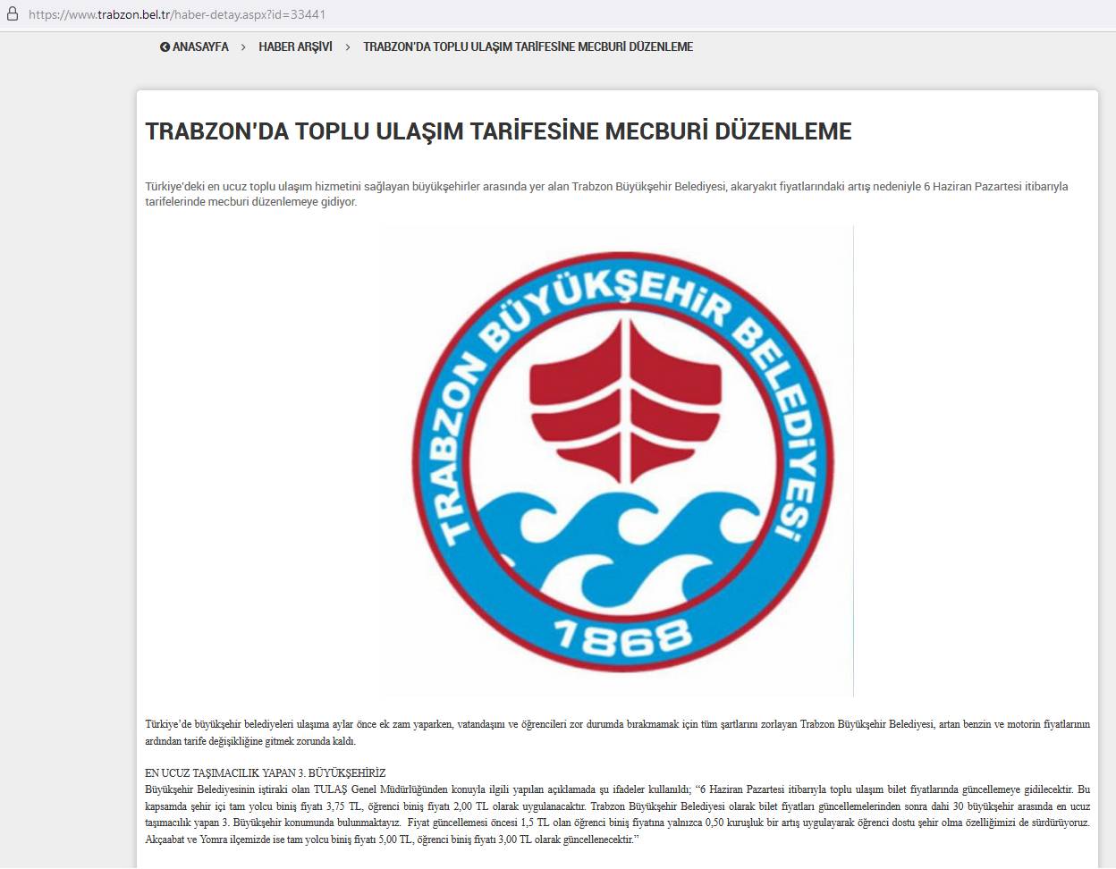 AKP'li Trabzon Büyükşehir Belediyesi toplu ulaşıma zam yaptı. Şehir içi tam yolcu biniş fiyatı 3 lira 75 kuruş olurken öğrenci biniş fiyatı 2 lira oldu. Belediyenin sitesinde zamlanan akaryakıt fiyatları sebebiyle 'tarife değişikliğine' gidilmek zorunda olduğu belirtildi.