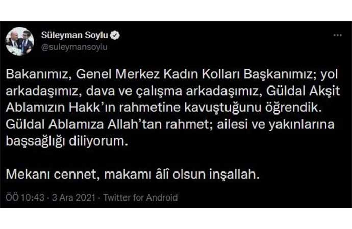 İçişleri Bakanı Süleyman Soylu, eski bakanlardan AKP Genel Merkez Kadın Kolları Başkanı Güldal Akşit'in yaşamını yitirdiğini duyurdu.