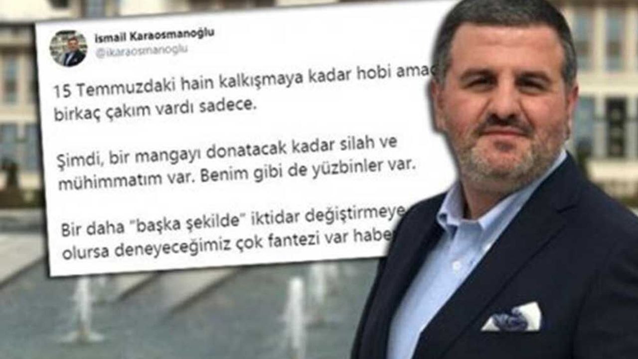 Bir mangayı donatacak kadar silahı olduğunu söyleyerek tehditler Kocaeli Büyükşehir Belediyesi eski başkanı İbrahim Karaosmanoğlu’nun oğlu ve AKP Gençlik Kolları eski genel başkanı İsmail Karaosmanoğlu'nun 2013 yılında yaptığı paylaşım ile FETÖ'yü övdüğü ortaya çıktı. https://tele1.com.tr/olum-tehditleri-savuran-akpli-karaosmaoglu-mangayi-donatacak-silahim-var-165091/ FETÖ'den 'hizmet hareketi' ifadeleriyle bahseden İsmail Karaosmanoğlu'nun "Ak Parti adına konuşan hiç kimse Hizmet hareketini tahkir ve tezyif eden tek bir kelime dahi etmez, eden olursa da buralarda barınamaz." ifadeleriyle FETÖ'yü eleştirenleri de tehdit ettiği görüldü.