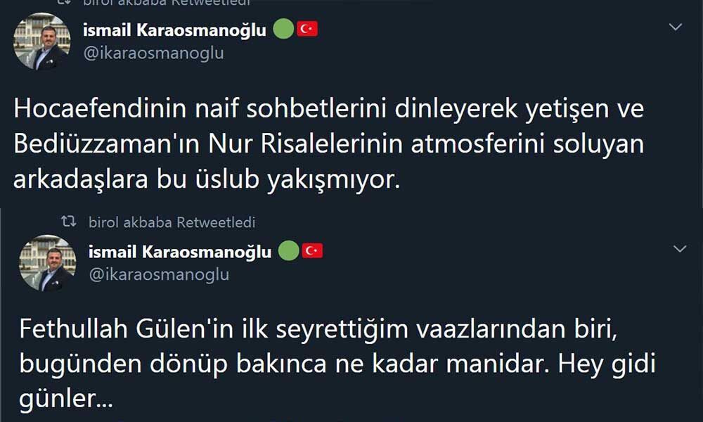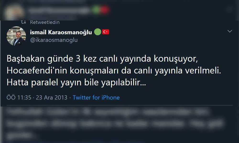 AKP'li İsmail Karaosmanoğlu'nun FETÖ'yü övdüğü ve eleştirenleri uyardığı bir paylaşımı ortaya çıktı.