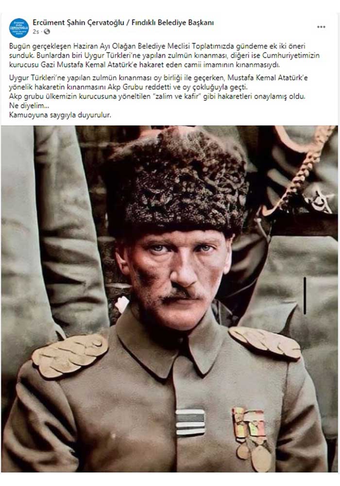 Rize'nin Fındıklı Belediye Başkanı Ercüment Şahin Çervatoğlu de bugün kurumsal sosyal medya hesabından, Atatürk’e yönelik hakaretin kınanmasını reddeden AKP’li meclis üyelere tepki gösterdi. Çervatoğlu, "Mustafa Kemal Atatürk’e yönelik hakaretin kınanmasını AKP Grubu reddetti ve oy çokluğuyla geçti. AKP grubu ülkemizin kurucusuna yöneltilen “zalim ve kafir” gibi hakaretleri onaylamış oldu" dedi. https://tele1.com.tr/makam-odasina-ataturk-fotografi-konmadi-mhpli-vekil-ziyaret-etti-408004/ Çervatoğlu şu ifadeleri kullandı: "Bugün gerçekleşen Haziran Ayı Olağan Belediye Meclisi Toplatımızda gündeme ek iki öneri sunduk. Bunlardan biri Uygur Türkleri’ne yapılan zulmün kınanması, diğeri ise Cumhuriyetimizin kurucusu Gazi Mustafa Kemal Atatürk’e hakaret eden camii imamının kınanmasıydı. https://tele1.com.tr/cumhur-ittifakinda-ataturk-catlagi-salonu-terk-ettiler-406268/ Uygur Türkleri’ne yapılan zulmün kınanması oy birliği ile geçerken, Mustafa Kemal Atatürk’e yönelik hakaretin kınanmasını AKP Grubu reddetti ve oy çokluğuyla geçti. AKP grubu ülkemizin kurucusuna yöneltilen “zalim ve kafir” gibi hakaretleri onaylamış oldu. Ne diyelim... Kamuoyuna saygıyla duyurulur."