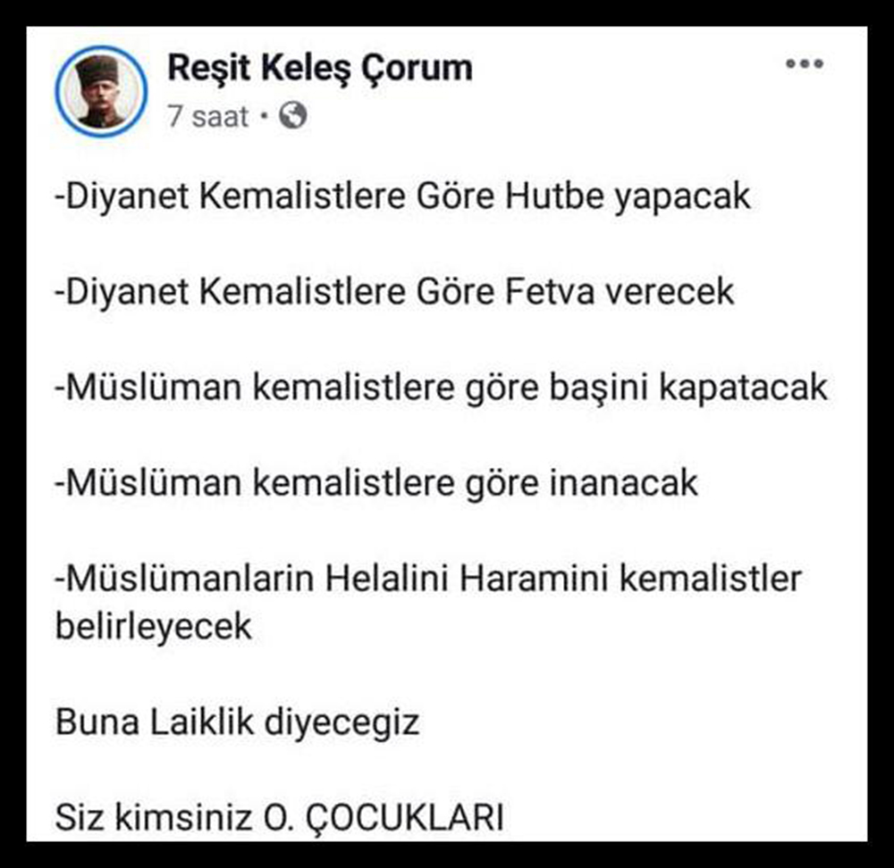 AKP Çorum Belediye Meclis Üyesi Reşit Keleş, Diyanet'in 30 Ağustos hutbesinde Atatürk'ü anmamasını eleştirenlere Facebook hesabından "Siz kimsiniz O. çocukları" diyerek küfür etti.