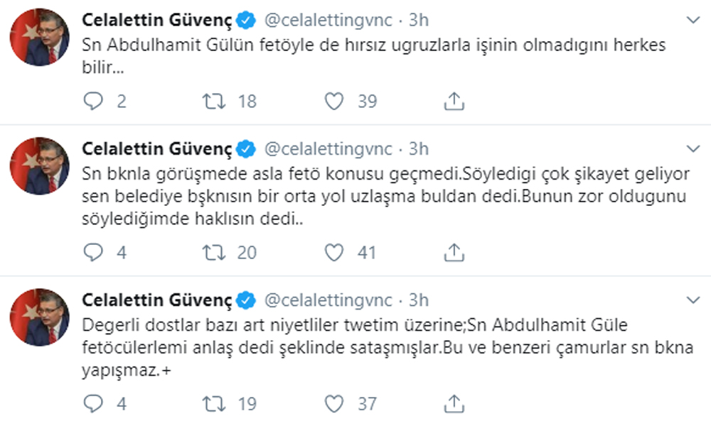 AKP Kahramanmaraş Milletvekili Celalettin Güvenç, Şanlıurfa yerel medyasında kendisi hakkında FETÖ'cü olduğuna yönelik haberler olduğunu ve bunların gerçeği yansıtmadığını savundu. Kişisel Twitter hesabından çarpıcı paylaşımlarda bulunan Güvenç, Şarlıurfa'da Büyükşehir Belediye Başkanı olduğu dönemde, o zaman AKP Genel Sekreteri olan Adalet Bakanı Abdülhamit Gül'ün kendisinden "FETÖ'cülerle uzlaşmasını" istediğini iddia etti. Güvenç, Gül'ün bu teklifine "Bu işlerin devlete maliyeti var yapamam" diyerek cevap verdiğini söyledi.