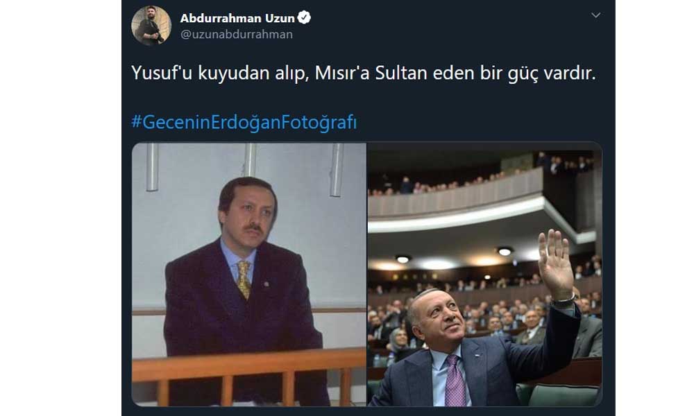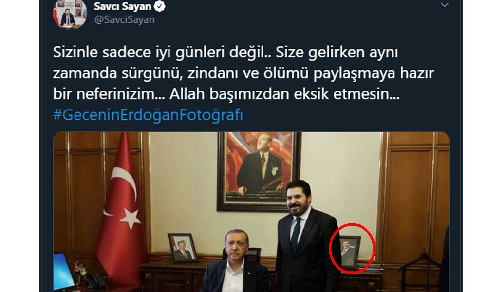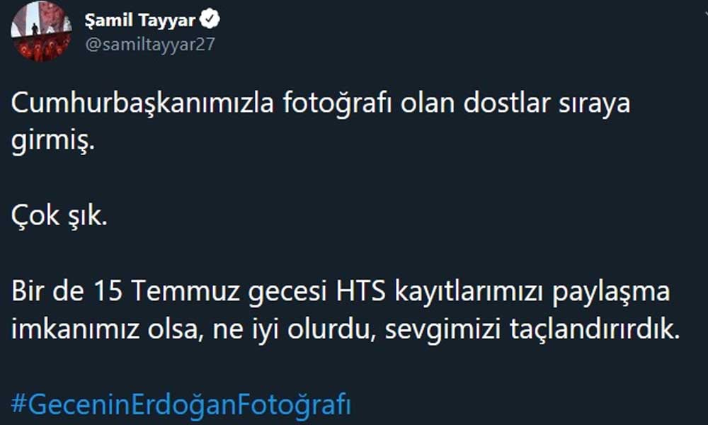 AKP'liler Twitter'da “#GeceninErdoğanFotoğrafı” etiketiyle AKP'li Cumhurbaşkanı Recep Tayyip Erdoğan'ın fotoğraflarını paylaşırken, AKP eski Milletvekili Şamil Tayyar'ın paylaşımı dikkat çekti.