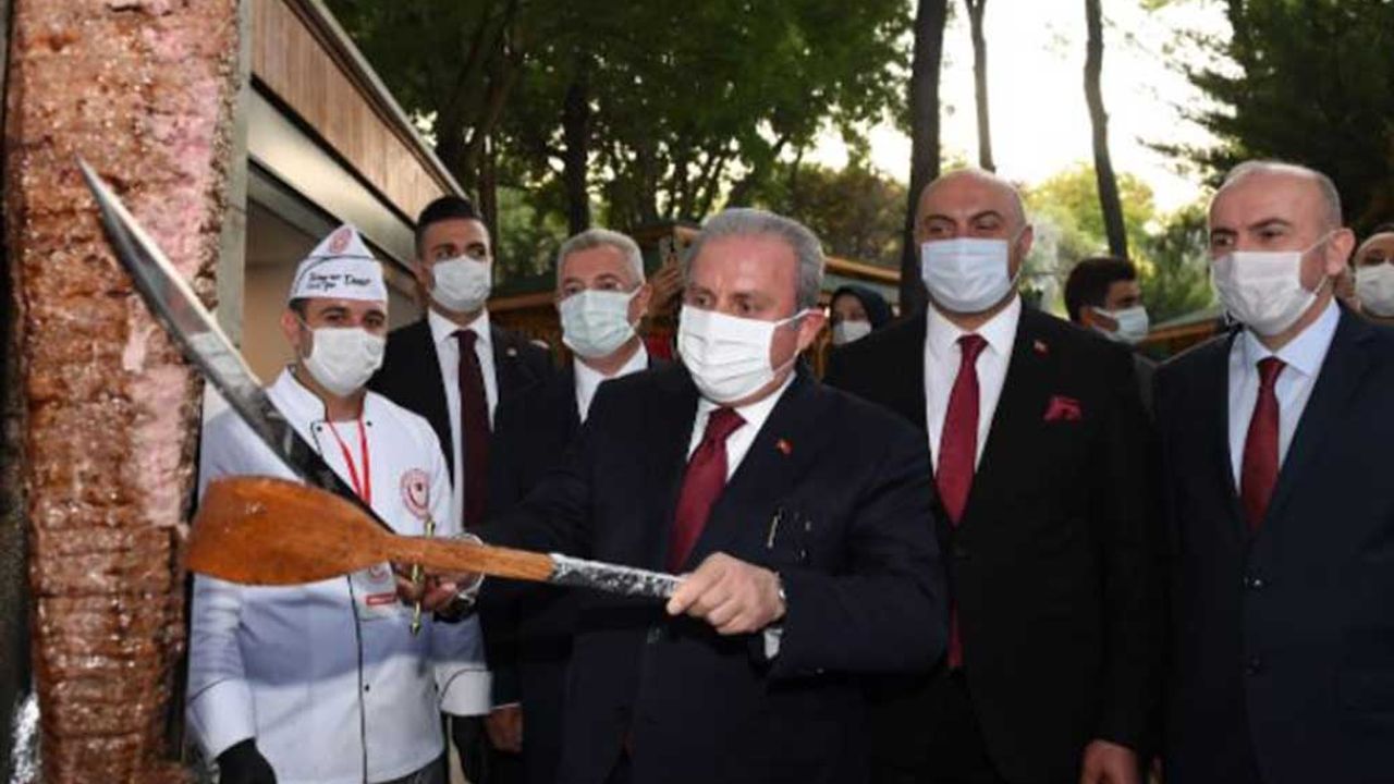 TBMM Başkanı Mustafa Şentop, yeni yasama yılı nedeniyle Meclis'i ziyaret eden Uluslararası Döner Federasyonu Başkanı Mehmet Mercan ve yöneticilerin kendisine hediye ettiği kılıçla döner kesti.