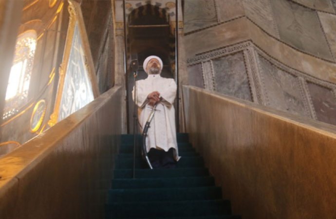 Ayasofya’daki ilk cuma hutbesini okumak için minbere çıkan Diyanet İşleri Başkanı Ali Erbaş'ın elinde kılıç olması tartışma yaratmıştı.