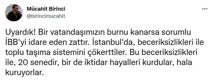AKP'li Mücahit Birinci sosyal medya hesabından İstanbul Büyükşehir Belediyesi'ni suçlayan bir mesaj yayımladı.