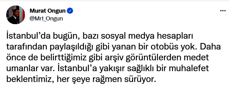 İstanbul’da bugün, bazı sosyal medya hesapları tarafından paylaşıldığı gibi yanan bir otobüs yok. Daha önce de belirttiğimiz gibi arşiv görüntülerden medet umanlar var. İstanbul’a yakışır sağlıklı bir muhalefet beklentimiz, her şeye rağmen sürüyor.